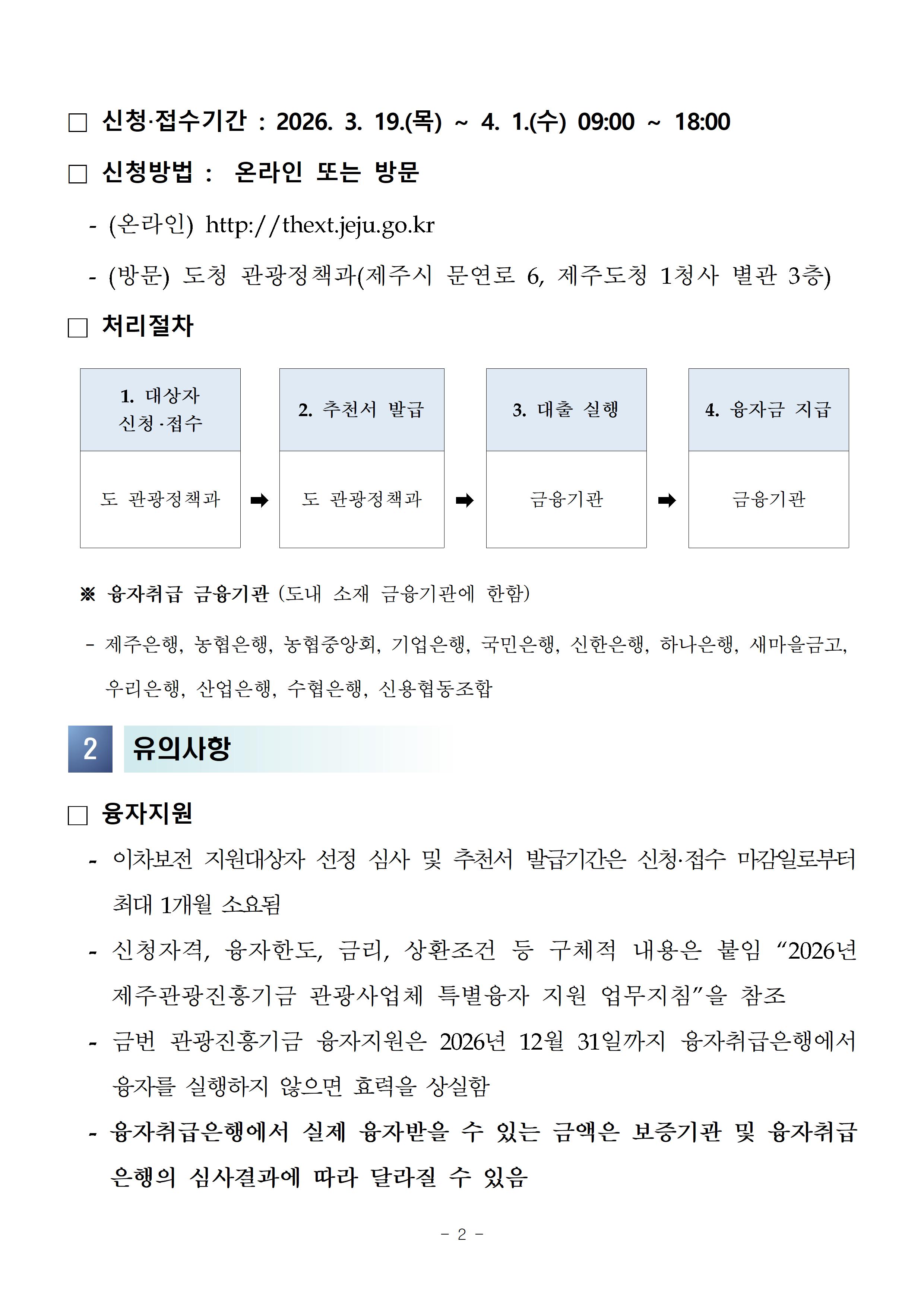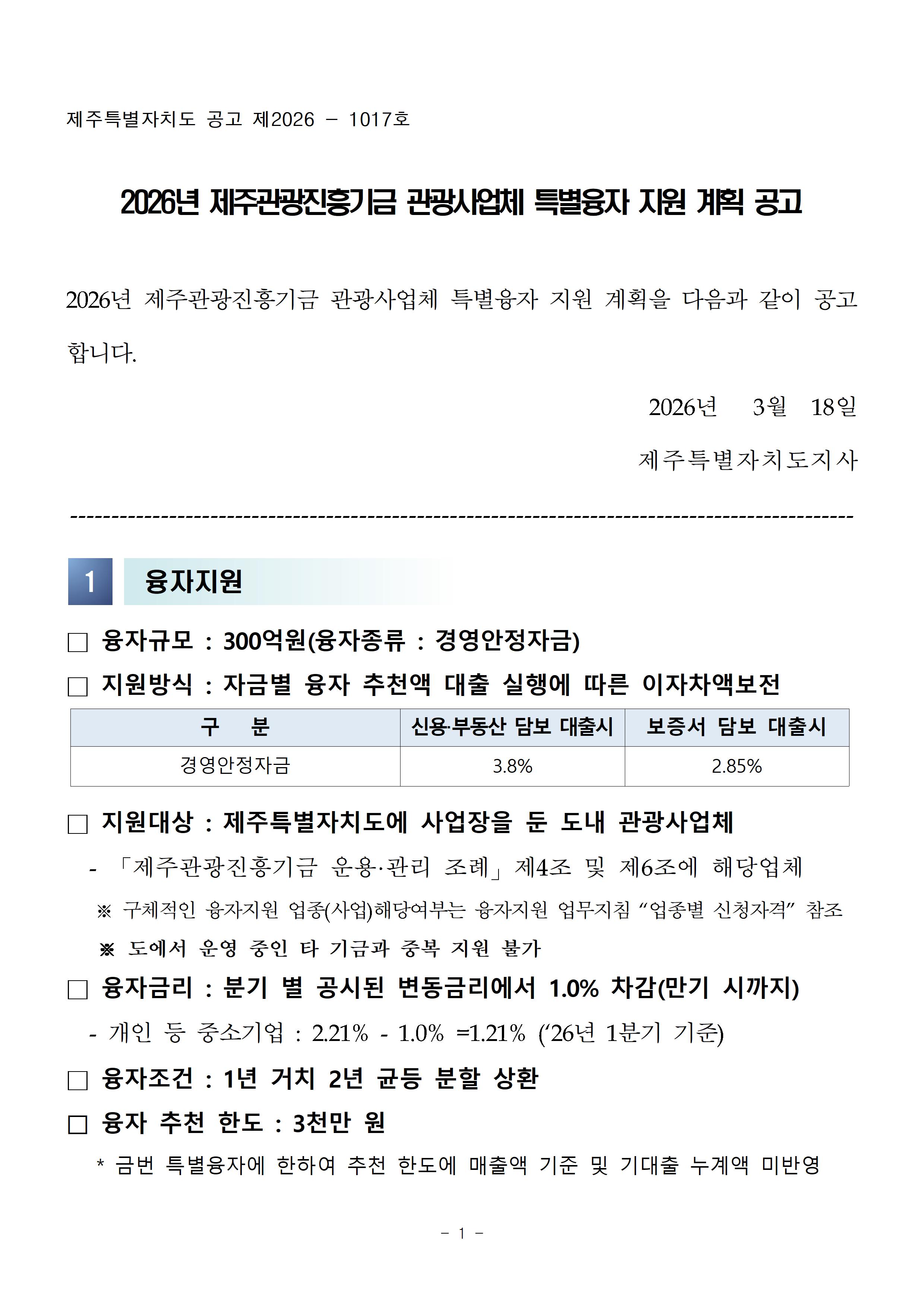 2026년 상반기 제주관광진흥기금 관광사업체 특별융자 지원 계획 공고 알림