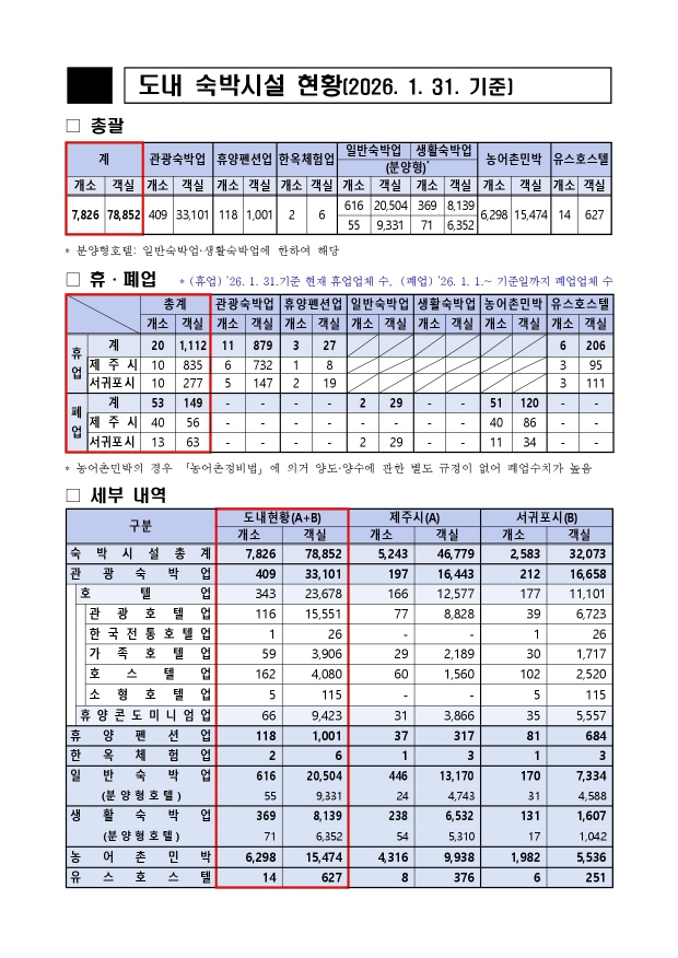 도내 숙박업소(등록) 현황(2026년 1월말 기준) 입니다.