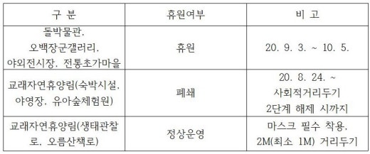 제주형 생활방역 위원회 회의 개최 결과에 따라 돌문화공원 관람객 등의 안전 확보를 위하여 아래와 같이 제주돌문화공원이 임시 휴원을 연장하오니 참고 바랍니다.가. 휴원기간 : 2020. 9. 3.(목) ~ 2020. 10. 5.(월)나. 휴원사유 : '코로나 19' 확산방지 및 관람객 등 안전보장다. 휴원구분