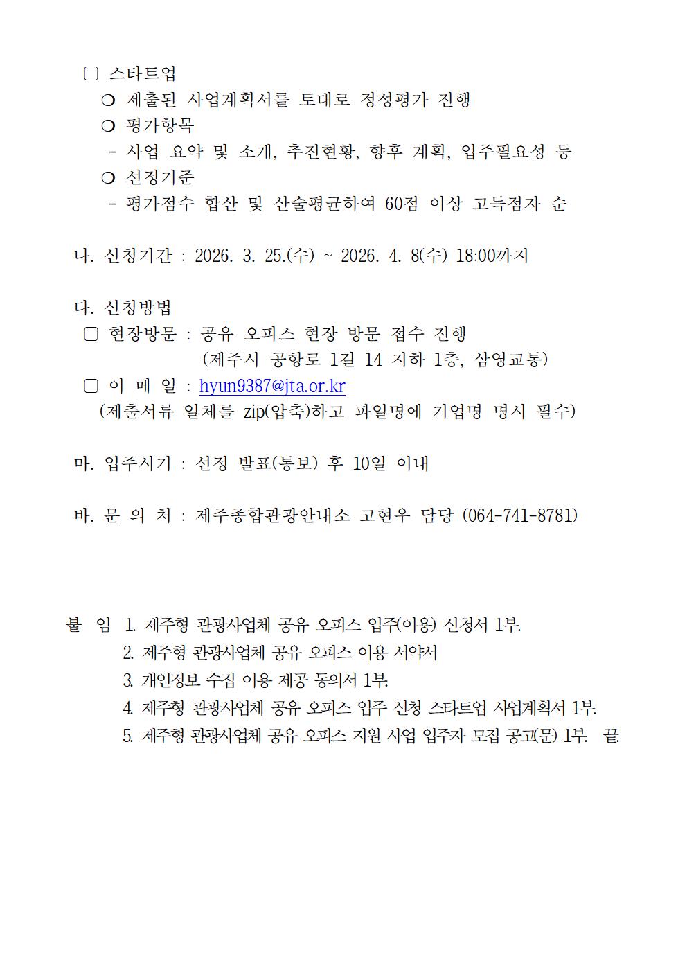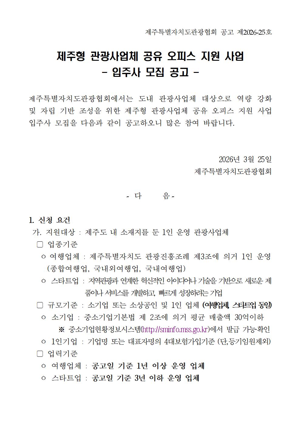 26년도 제주형 관광사업체 공유 오피스 지원 사업 상반기 입주사 모집 공고