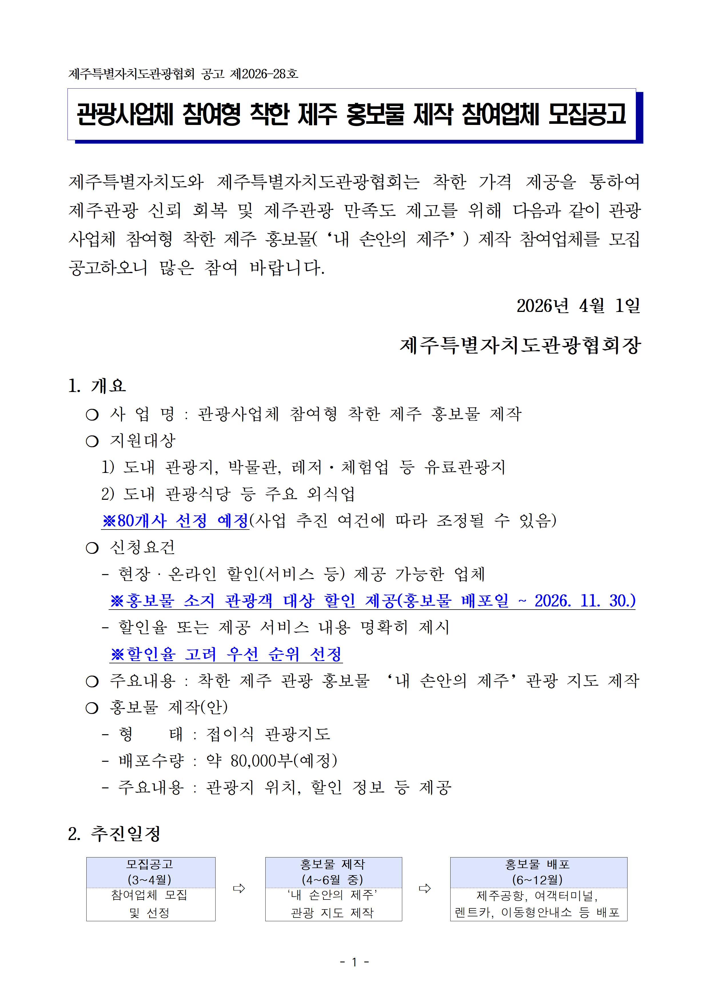 2026 관광사업체 참여형 착한제주 홍보물 제작 사업(내 손안의 제주 관광지도) 모집 공고