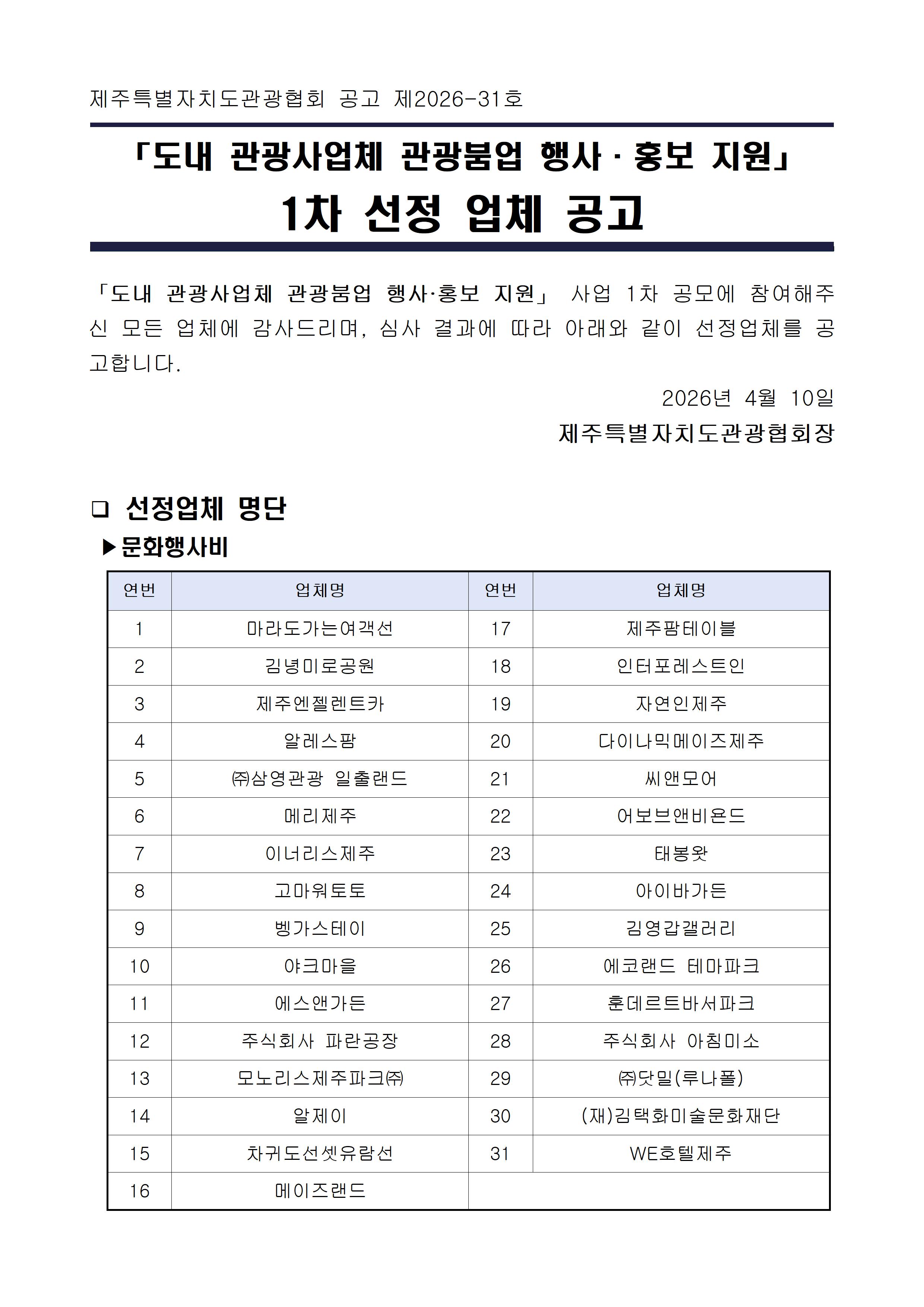 2026 도내 관광사업체 관광붐업 행사ㆍ홍보 지원 1차 모집 선정 공고
