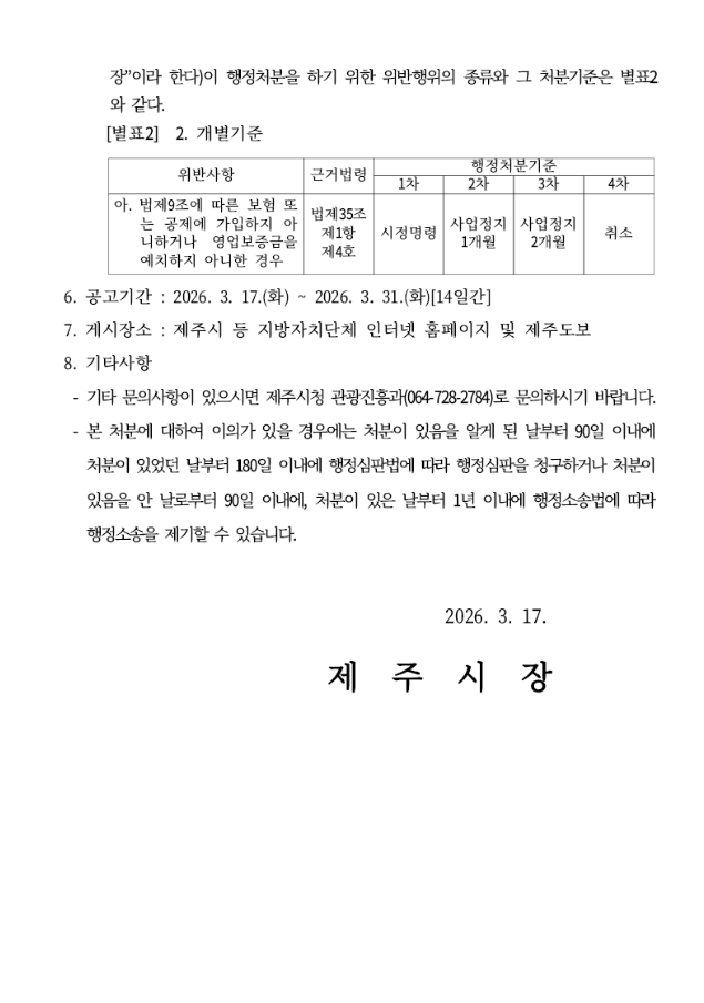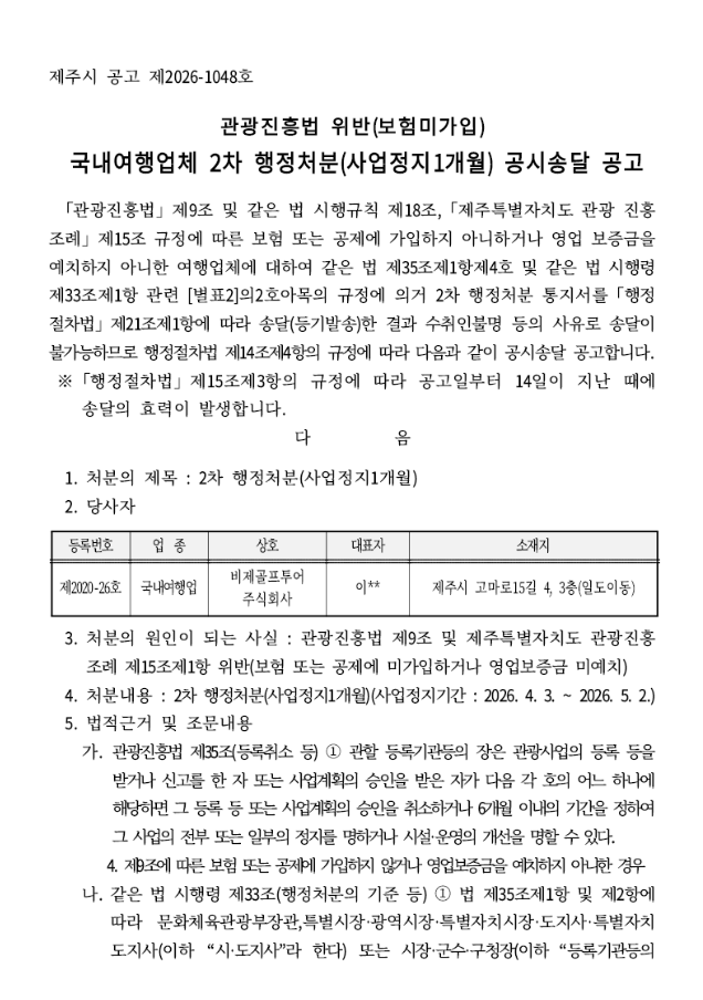 관광진흥법 위반(보험미가입) 국내여행업체 2차 행정처분(사업정지1개월) 공시송달 공고