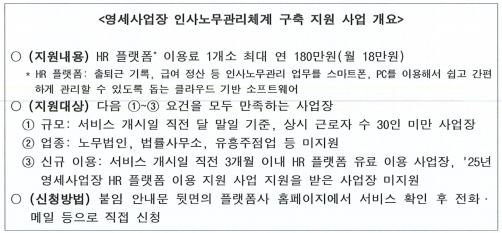 1. 고용노동부에서는 소규모 사업장의 인사노무관리 역량 강화와 취약노동자 보호를 위해 2026. 2. 1.부터 소규모 사업장 인사노무관리체계 구축지원 사업을 개시하였습니다. 이와 관련하여 근로자 수 30인 미만 사업장은 고용노동부가 선정한 13개 인사 관리(HR) 플랫폼에 유선 또는 이메일로 신청하여 최대 180만원(월 18만원) 상당의 서비스를 무료로 지원받을 수 있습니다.