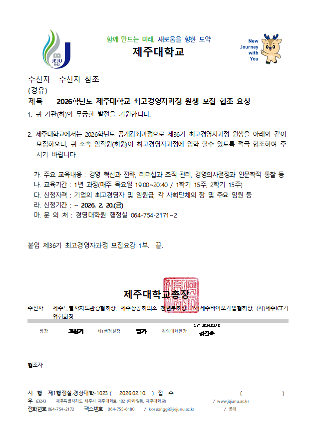 2026학년도 제주대학교 최고경영자과정 원생 모집 안내
