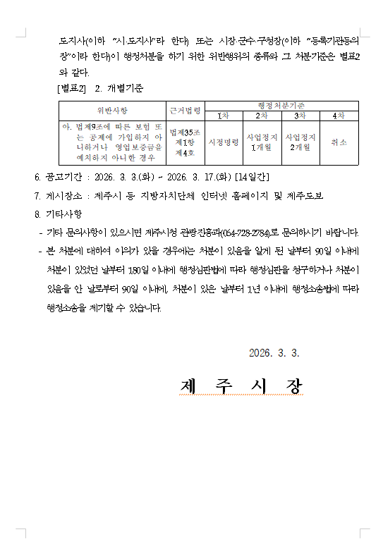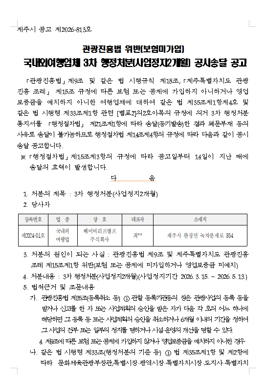 관광진흥법 위반(보험미가입) 국내외여행업체 3차 행정처분(사업정지2개월) 공시송달 공고