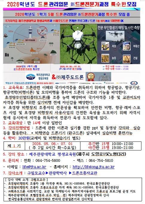 제주관광대학교 평생교육원 <新드론관리입문 전문가과정> 모집 안내