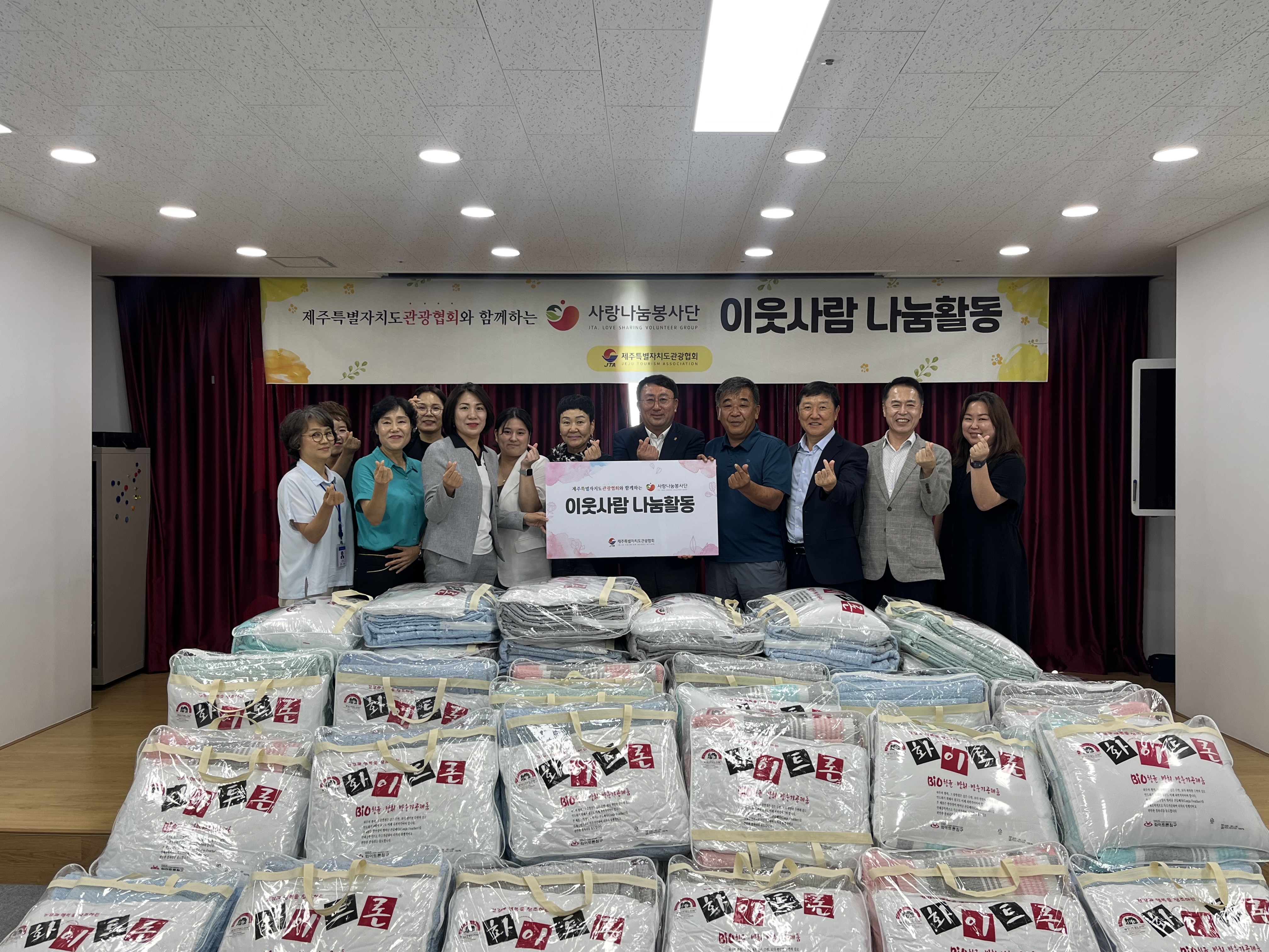 제주특별자치도관광협회(회장 강동훈) 소속 사랑나눔봉사단(단장 강옥선)은 8일 제주특별자치도 홀로사는노인복지센터 제주시(센터장 김지수), 서귀포시(센터장 이은경)에 여름이불세트 64채(300만원 상당)를 전달했다.