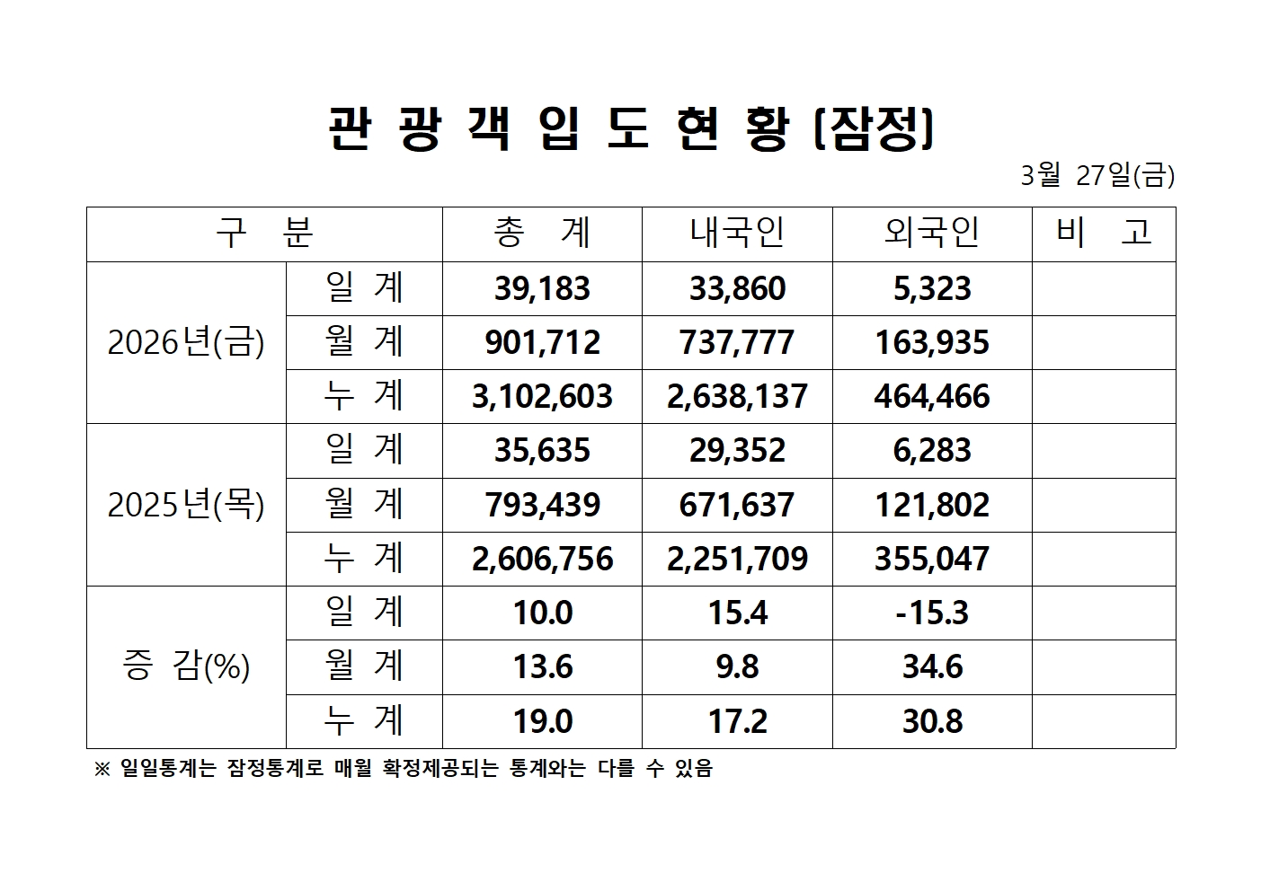 2026년 3월 27일(금) 관광객내도현황