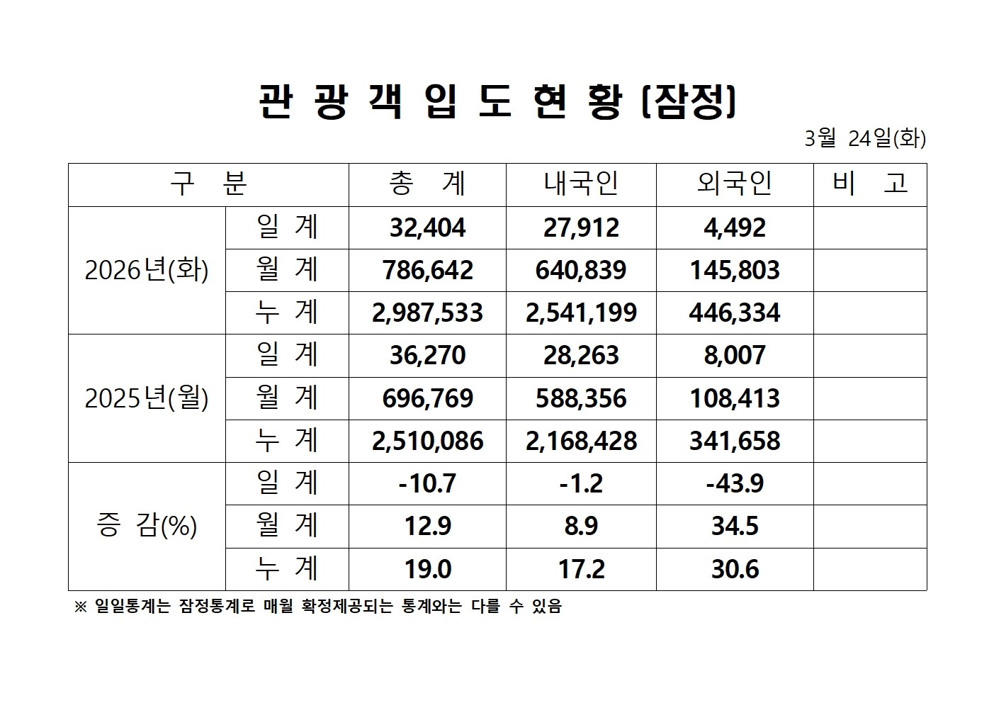 2026년 3월 24일(화) 관광객내도현황