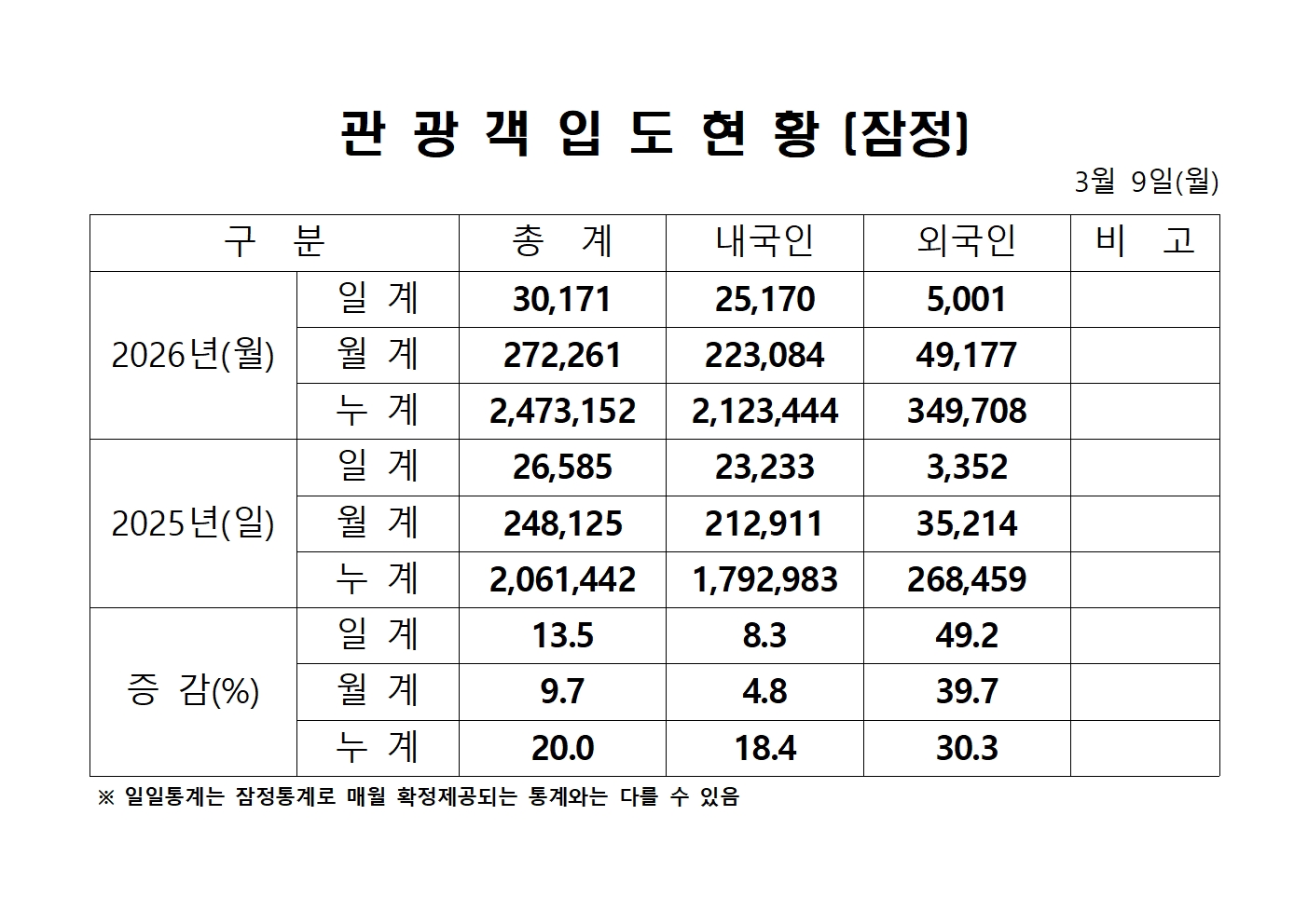 2026년 3월 9일(월) 관광객내도현황