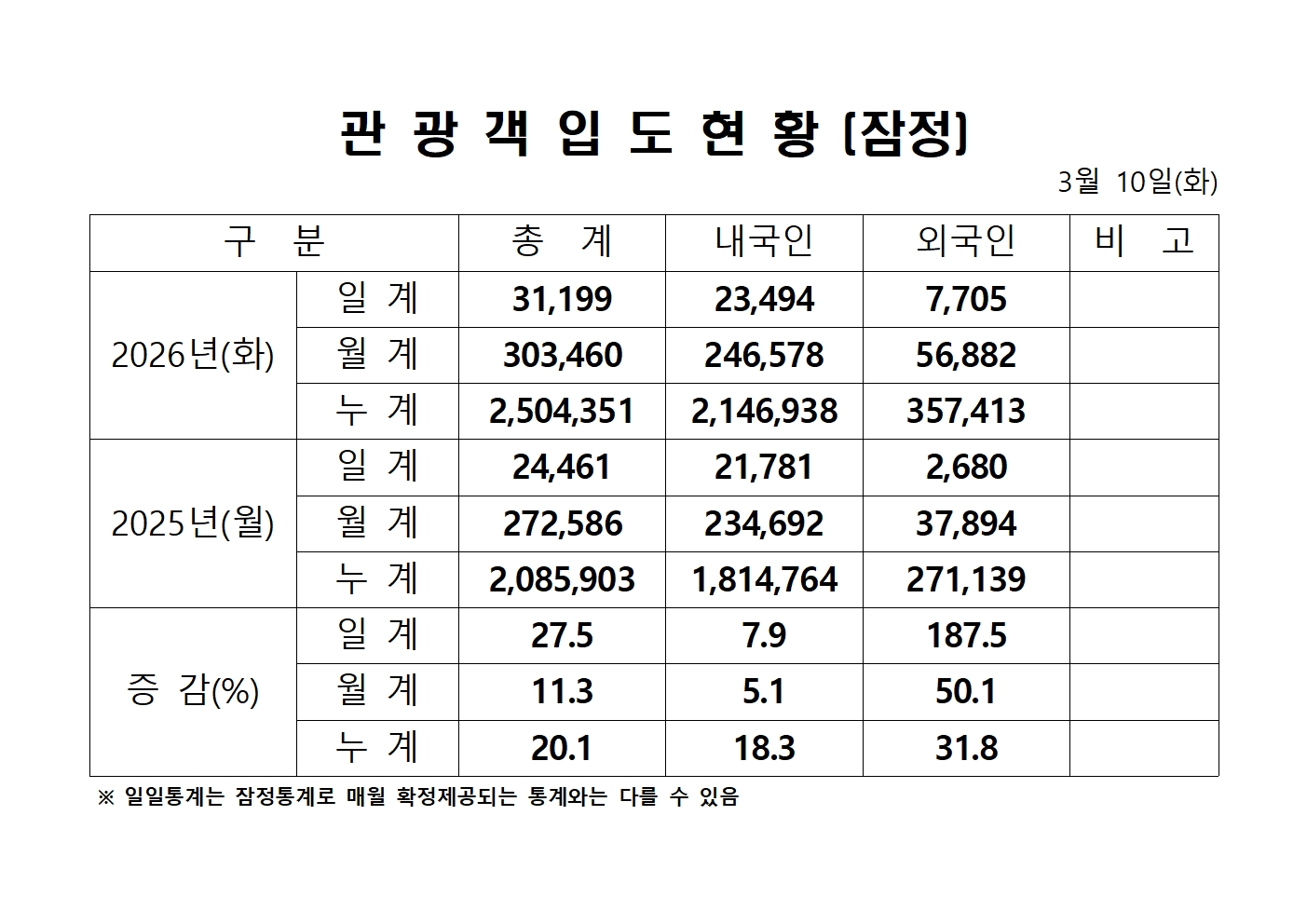 2026년 3월 10일(화) 관광객내도현황