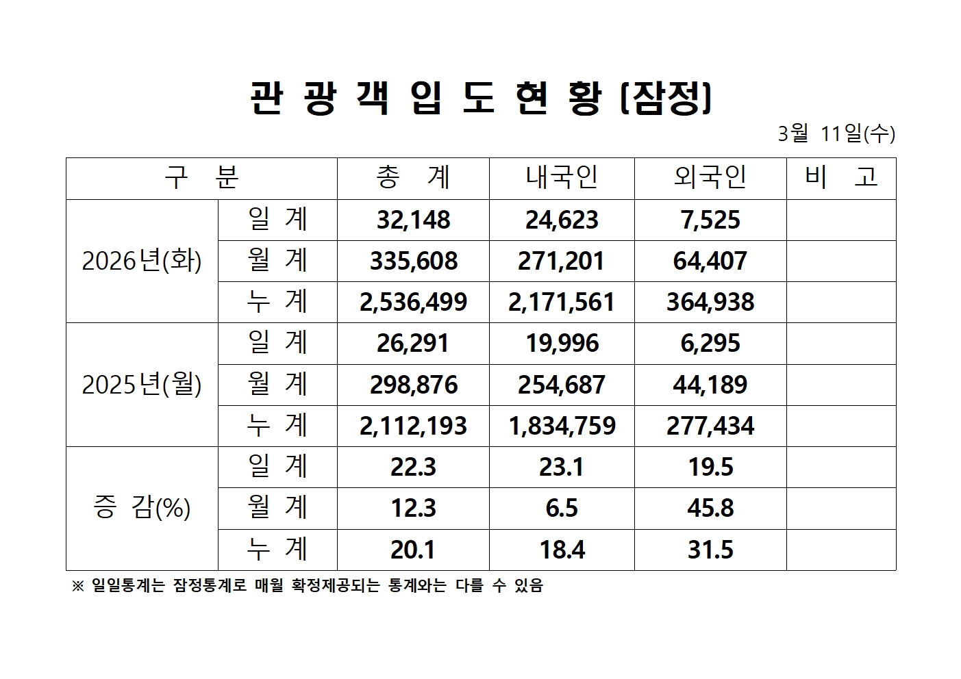 2026년 3월 11일(수) 관광객내도현황