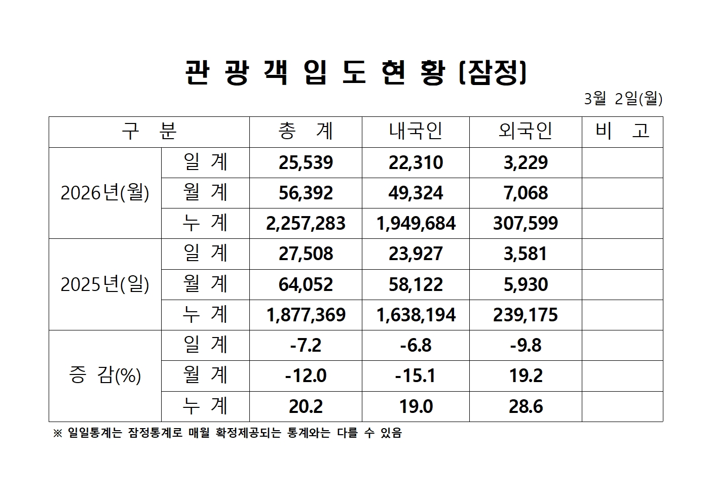 2026년 3월 2일(월) 관광객내도현황