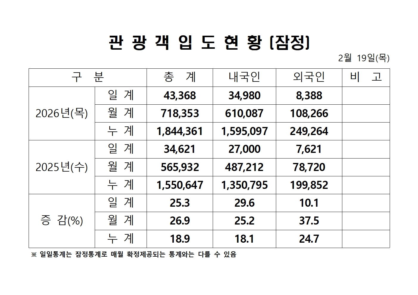 2026년 2월 19일(목) 관광객내도현황