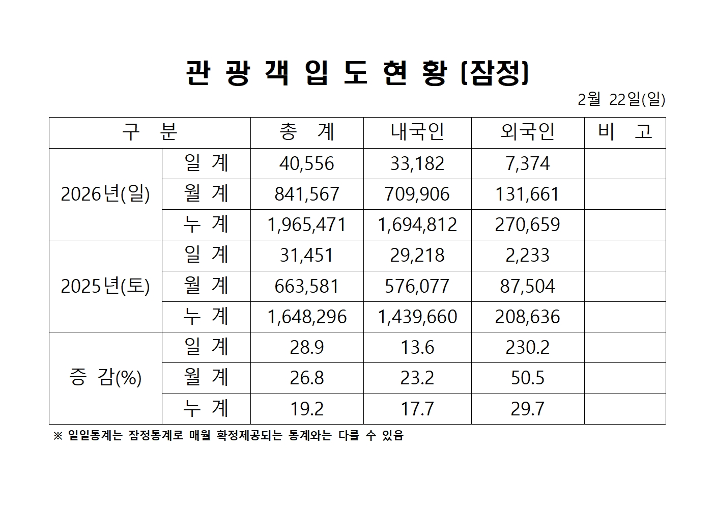 2026년 2월 22일(일) 관광객내도현황