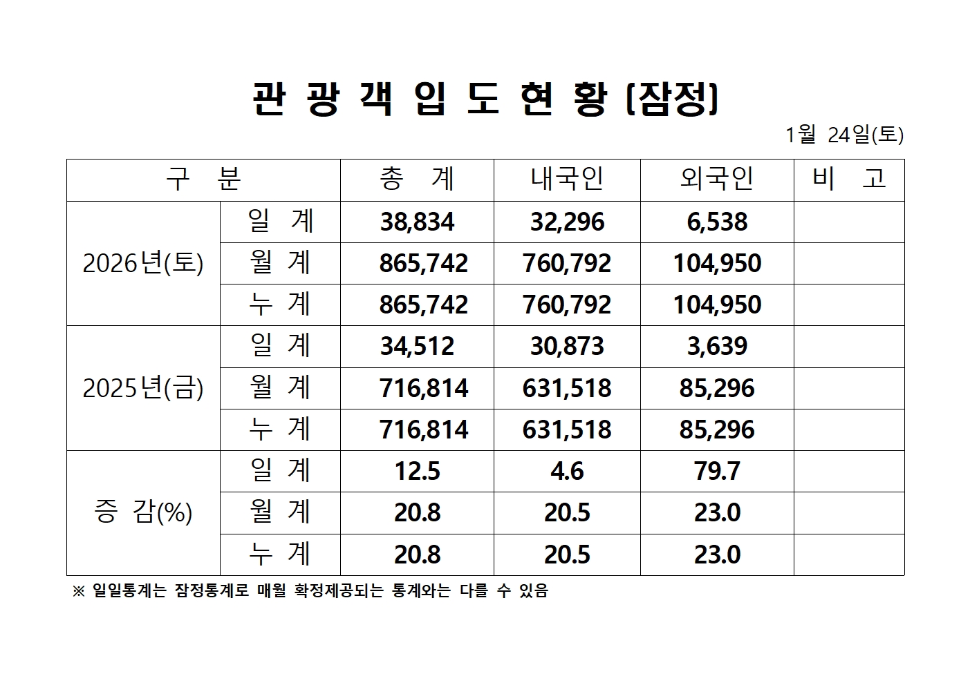 2026년 1월 24일(토) 관광객내도현황