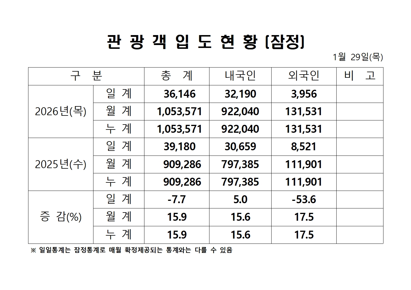 2026년 1월 29일(목) 관광객내도현황