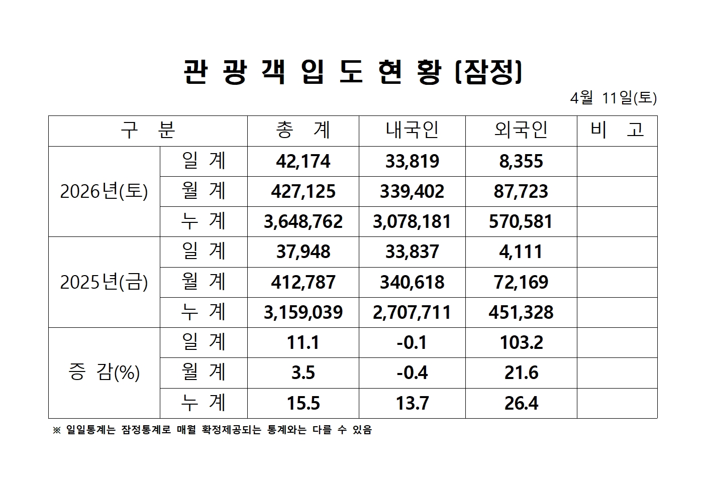 2026년 4월 11일(토) 관광객내도현황