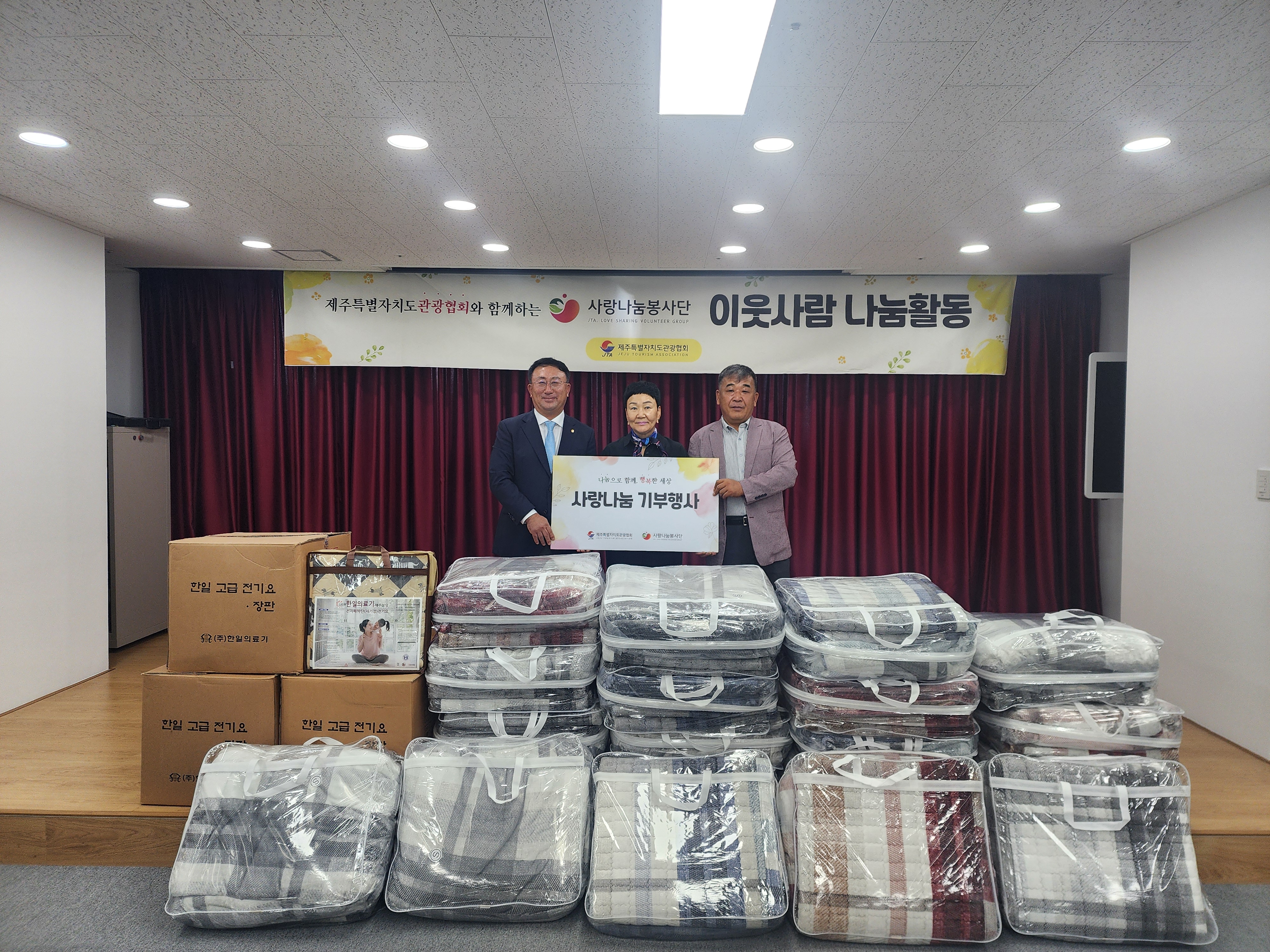 제주특별자치도관광협회(회장 강동훈) 소속 사랑나눔봉사단(단장 강옥선)18일 제주특별자치도 홀로사는노인복지센터 제주시(센터장 김지수) 겨울이불세트, 전기요 각 20(300만원 상당) 전달했다.